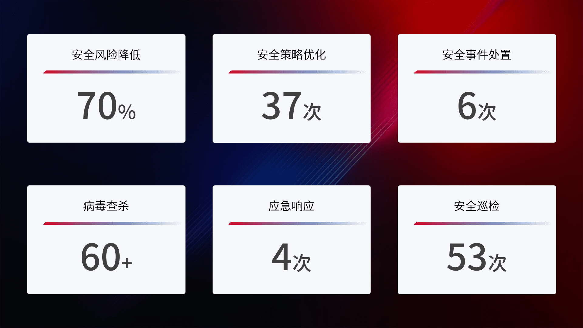 提供全面的安全事件报告体系,,,包括处置报告、、、周报、、季度和年度总结,,结合持续监控,,,,帮助客户深入了解网络安全状况。。